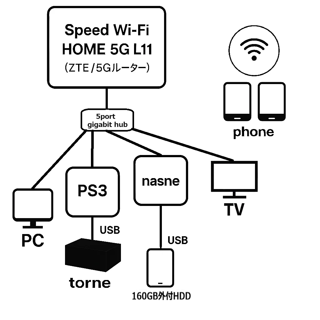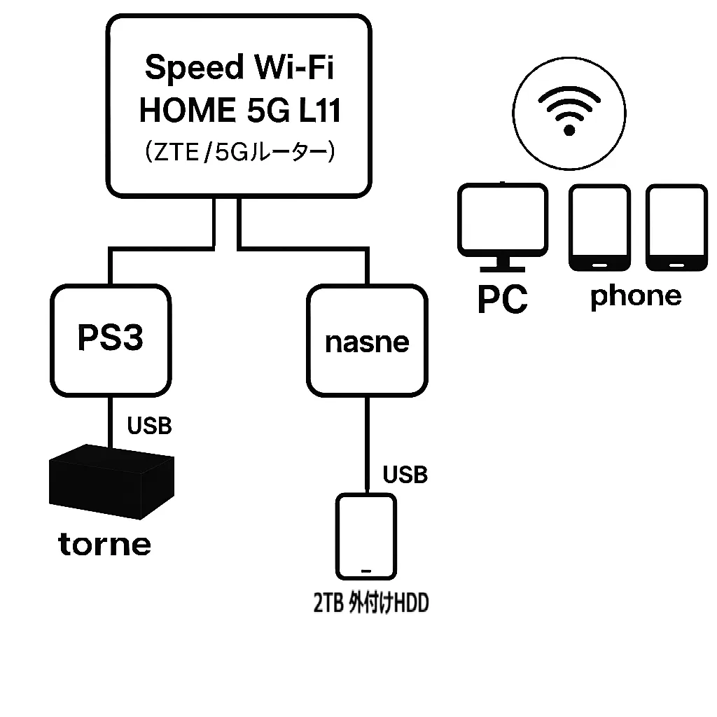 ルーターにLANポートが2口あったので、それぞれをPS3とnasneに繋いでいました。この時点ではPCはWi-Fi接続で使用しています。TVへはLANポートの数が足りないのでこの時は繋いでおらずTVから直接、nasneの録画をDNLA再生することはしていませんでした。